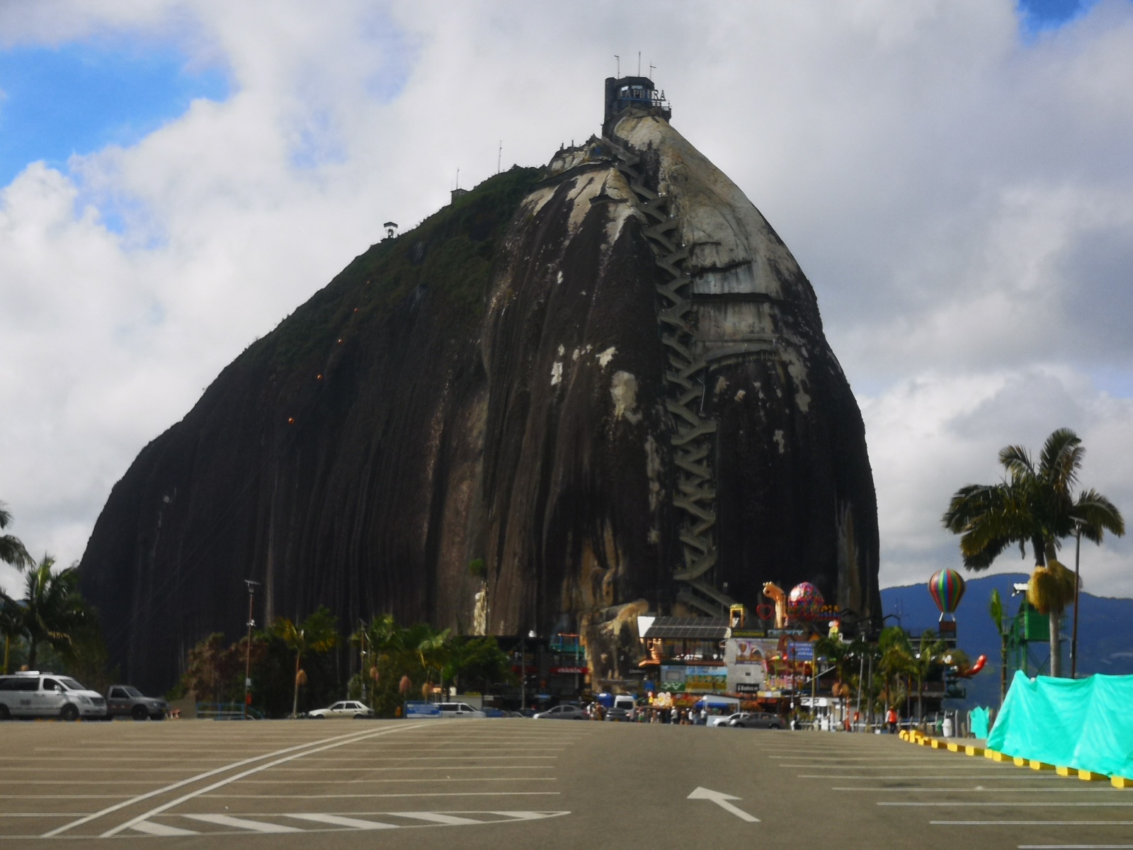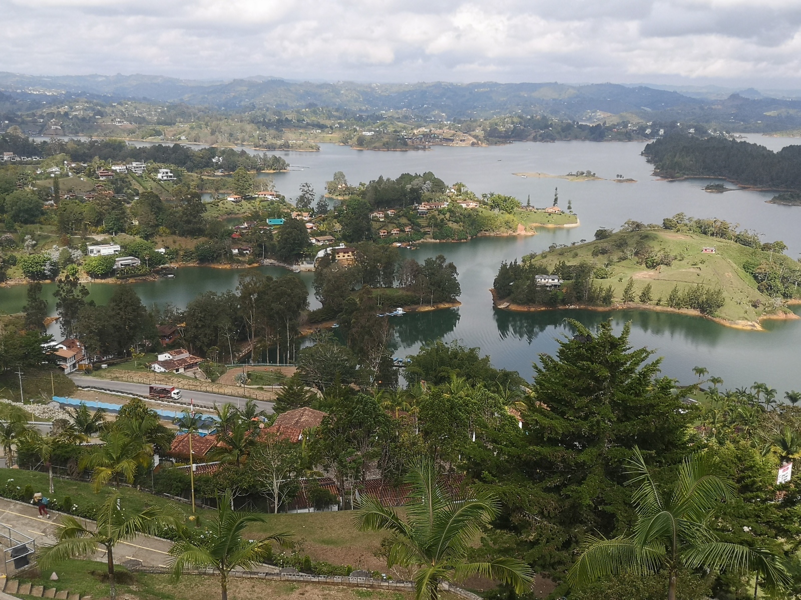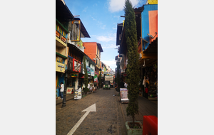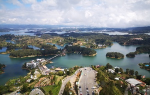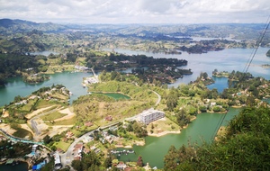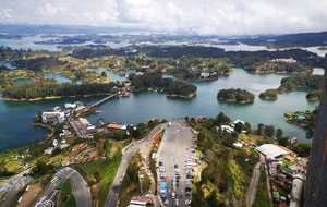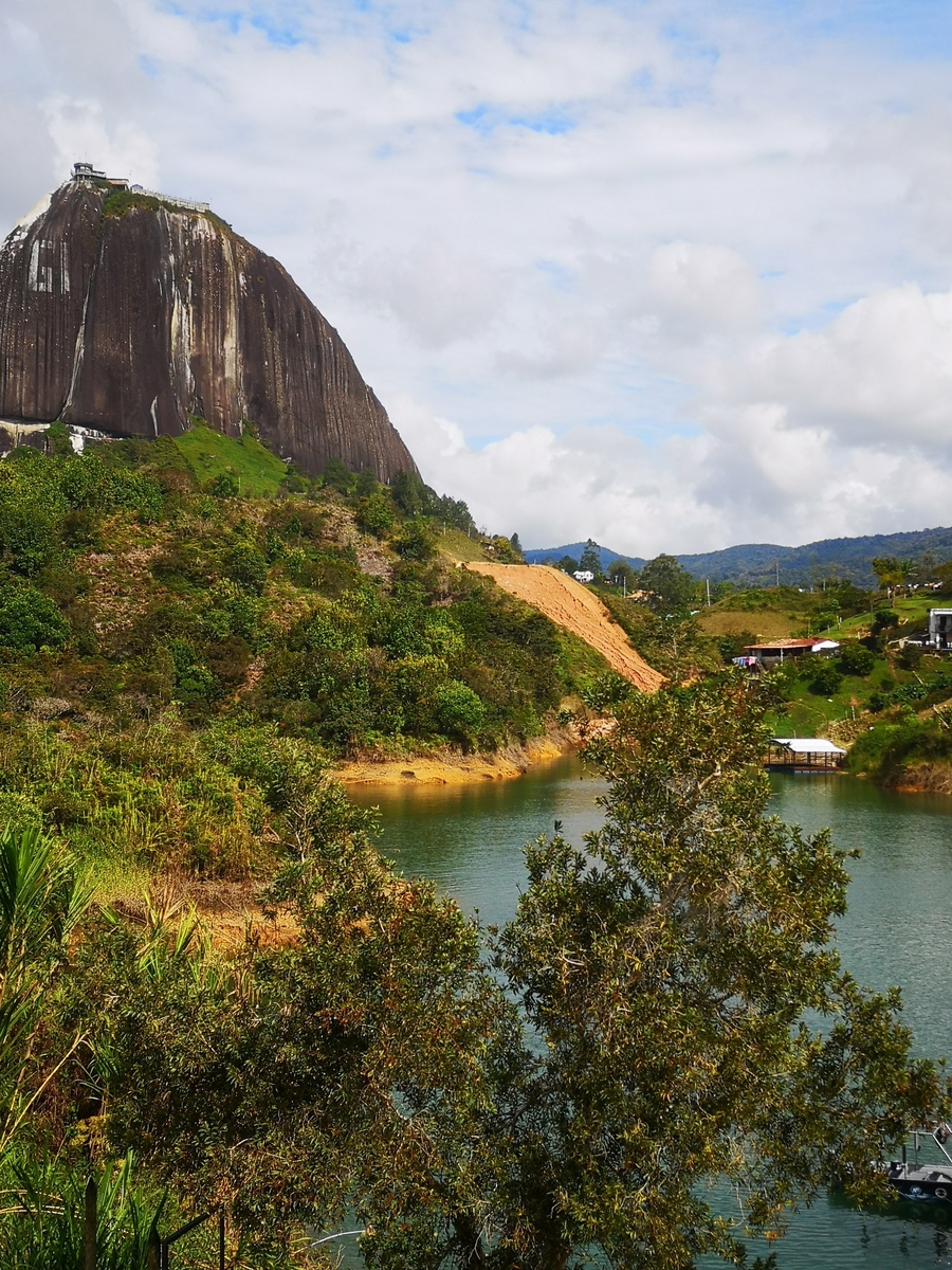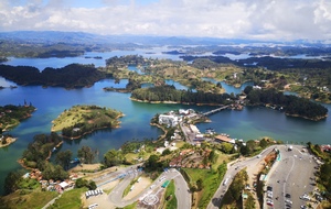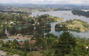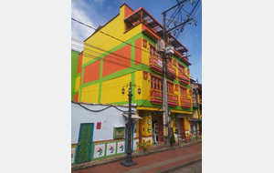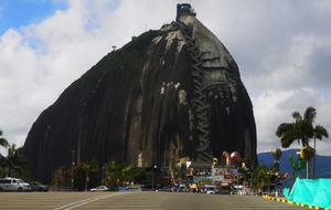 Puis ce fut la transition en vélo La Ceja – Guadape, nuveau lieu de séjour. Guadape est une ville très touristique, du à la construction d’un barrage hydroélectique à proximité qui a noyé la région et de ce fait Guadape est entourée de nombreuses iles ; de l’eau – 30 à 35 ° C, les bonnes conditions pour une station balnéaire. Les habitations très colorées de la ville la rendent encore plus attractives. Sa dent de granit du Peñol, avec 800 marches pour atteindre le sommet, reste un grand moment, avec une vus imprenable sur les evirons. Mais toujours un relief environnant à plus de 2000 mètres. Contrairement au Alpes qui présente un environnement très minéral avec les montées souvent en lacets, la partie visitée de la Cordillière se traduit par des collines boisées (culture du café) ou herbacées à perte de vue, donc jamais de sensation d’etre en haute montagne, sauf les poumons qui cherchaient de l’oxygène…