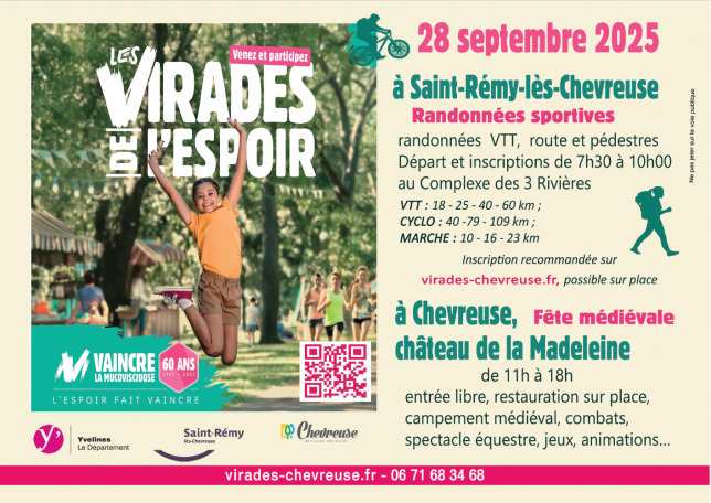 VIRADE DE L'ESPOIR Complexe sportif les 3 rivières – rue des écoles De 07:30 à 10:00 - Clôture 13:30 40 / 79 / 109 km Tarifs : L : 5€ / NL : 8€ / -18ans : 0€/ -18ans NL : 3€ 07931 - LE TEAM - http://virades-chevreuse.fr/ ROLLAND Gérard – 06 71 68 34 68 - gej.rolland@free.fr Manifestation caritative |