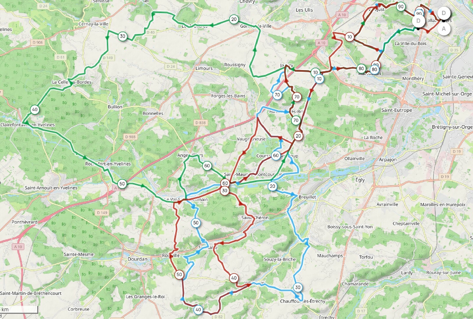 Heureusement, l’équipe était en forme — ou en tout cas, présente — et Claudio avait même annoncé son grand retour la veille. Bon, il avait déjà tenté de réduire les kilomètres en partant de chez lui, mais miracle : il était bien à Villejust 🙂. Là, nous sommes rejoints par le groupe des Costauds, puis le reste de la troupe arrive. Et hop, ça part sur les chapeaux de roue, Rémi en tête, façon lièvre sous caféine. C’est plat, c’est les Ulis, il fait encore soleil… bref, le bonheur avant l’effort.